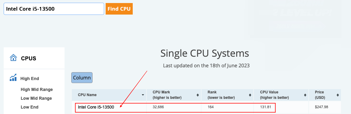 일반적인 CPU 벤치마크 점수로만 비교를 하기 위한 방법도 있습니다. 이 부분은 벤치마크 점수를 확인할 수 있는데요. 제가 예전에 시용했던 CPU인 라이젠3 2200G를 입력해보고 최신형 i5 13세대 제품을 확인해서 비교해 보았습니다. 점수 차체가 엄청난 차이를 보이는 것을 알 수 있는데요. 2200G는 6,777점 i5-13500은 32,686점이 나왔다는 것을 볼 수 있습니다. 이렇게 점수만 확인해 보는 것만으로도 쉽게 비교할 수 있습니다.
