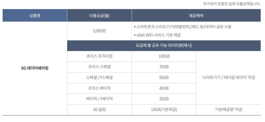 KT의 5G 요금제는 LTE와는 다릅니다. 기본적으로 5,000원의 요금을 내야 데이터쉐어링 이용이 가능합니다. 그런데 무료로 이용하는 방법도 있습니다. 고액 요금제를 사용하게 되면 데이터쉐어링 서비스가 무료로 이용이 가능합니다. 초이스 스페셜, 프리미엄이나 같은 8만원 이상의 요금제를 사용한다면 데이터쉐어링 1회선은 무료로 사용이 가능합니다.