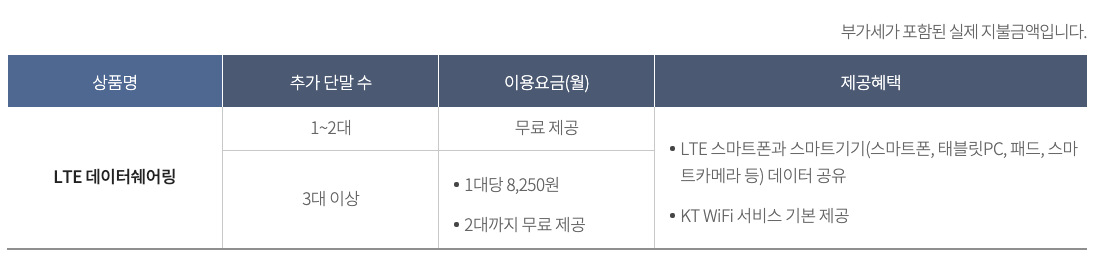 KT 데이터쉐어링 LTE의 경우 스마트폰과 스마트기기 1~2대 무료 제공이 됩니다. 3대부터는 8,250원이 매달 결제가 됩니다. 보통은 2대 정도까지면 쓰기 좋으니 유심이 들어가는 제품이 있다면 2대까지 사용하시면 됩니다. 물론 스마트폰의 데이터를 쓰는 것이지만 데이터쉐어링을 사용한다면 KT WiFi 서비스까지 사용할 수 있다니 이 부분도 정말 큰 장점이 되겠습니다. 가입방법은 LTE와 5G가 동일하니 아래에서 참고하시면 됩니다.
