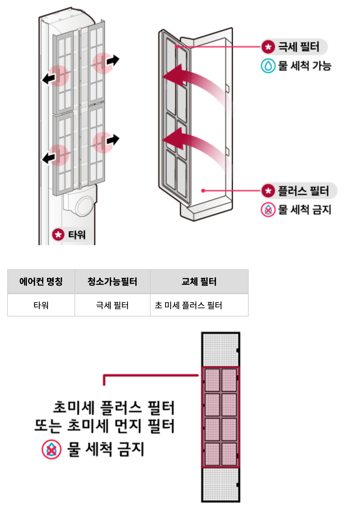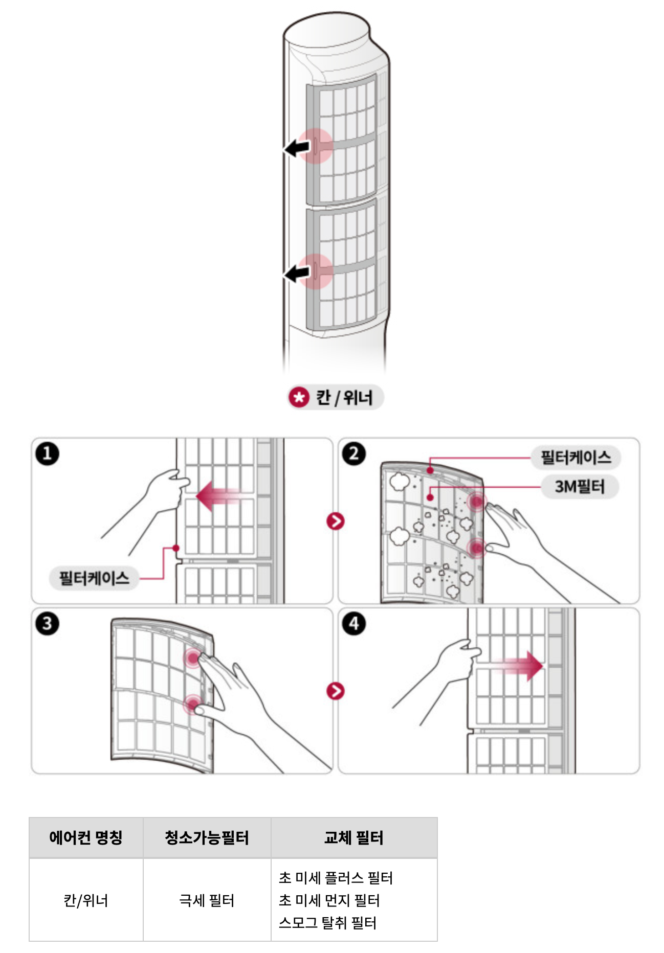 극세필터 분리방법은 기기별로 다른데요. 칸/위너, 타워, 듀얼 모델명에 따라 아래 사진을 참고합니다.