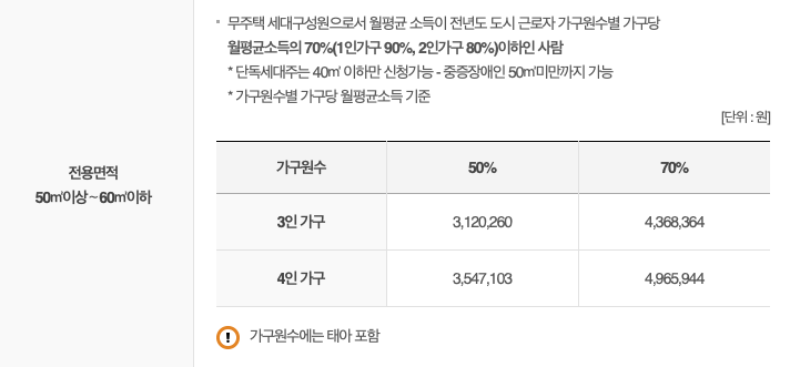 소득기준: 전년도 가구당 월평균소득 70% (1인 가구 90%,  2인가구 80%) 이하