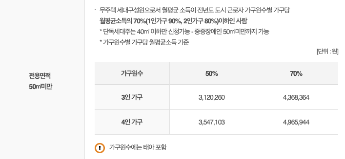 소득기준: 전년도 가구당 월평균소득 70% (1인 가구 90%, 2인가구 80%) 이하