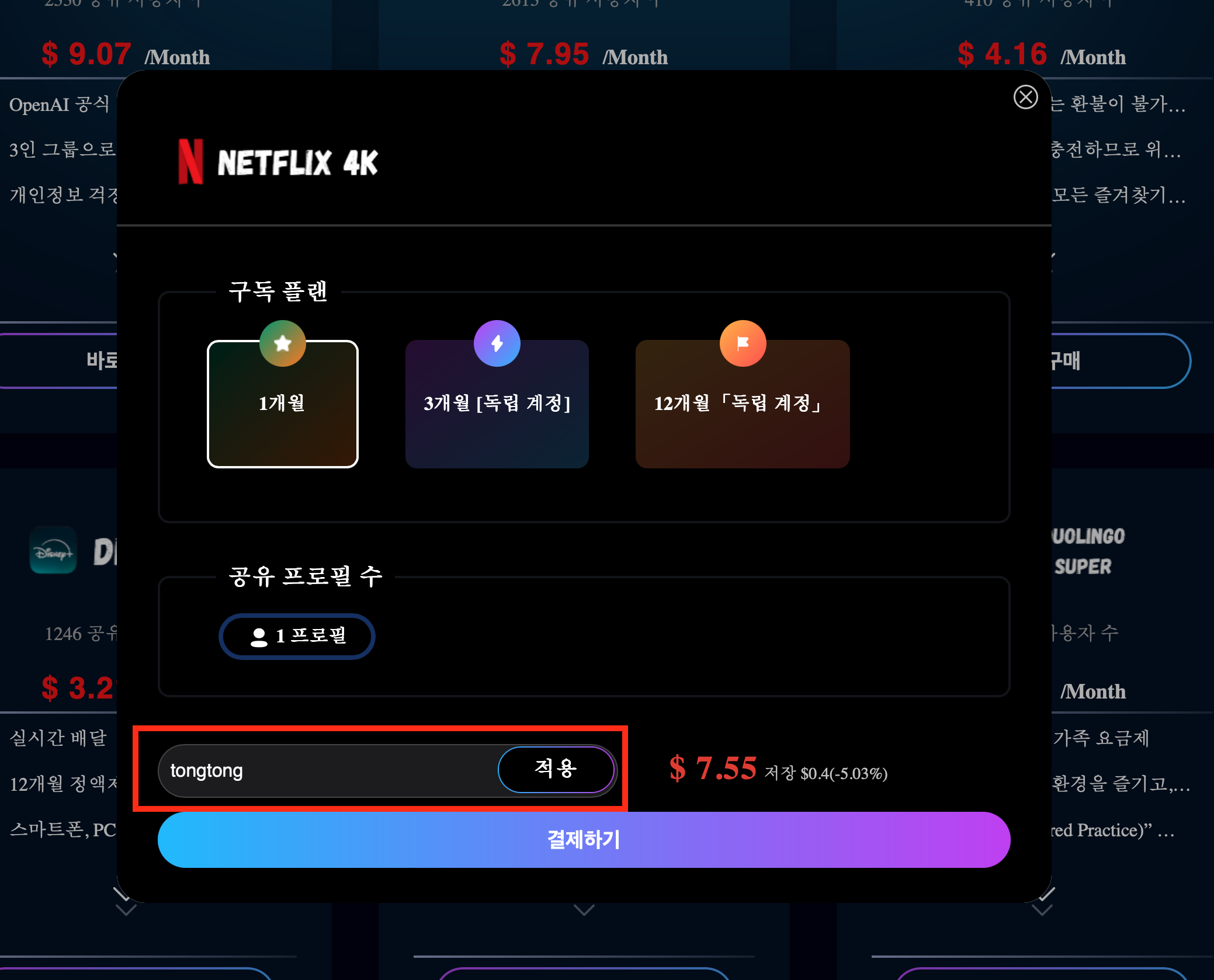 먼저 가장 많이 사용하는 넷플릭스를 구매해보도록 하겠습니다.