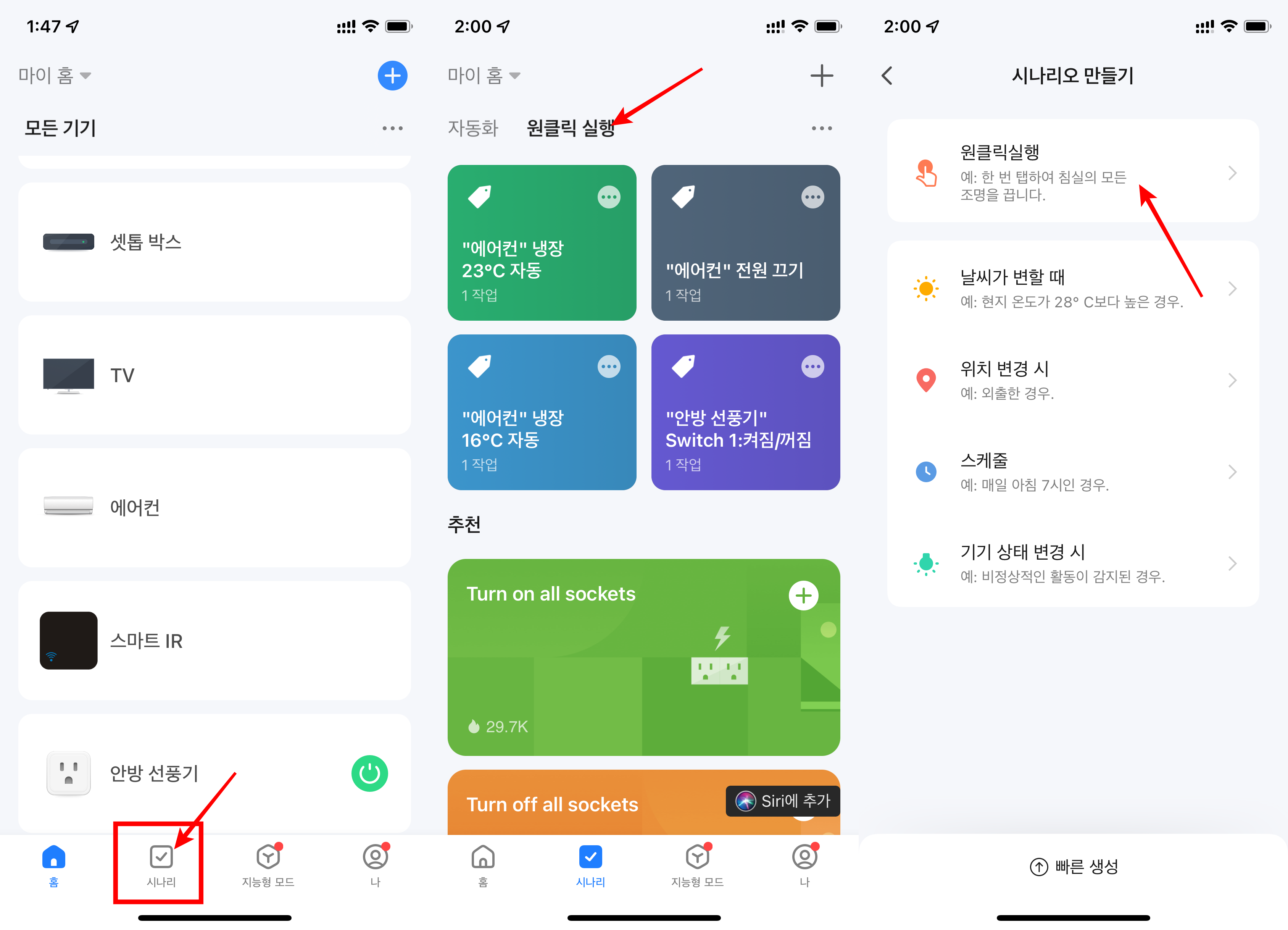 Smart Life 어플에는 시나리오 탭에 원클릭 기능이 있습니다. 이 기능은 애플의 단축어와 같은 맥락의 기능으로 여기서 기기를 추가하고 한번에 원하는 기능을 시나리오를 짜서 추가할 수 있습니다. 기기추가와 방식은 아래를 참고하시길 바랍니다. 아래 예시의 추가는 TV 전원 켜고 끄는 것을 추가하여보았습니다.