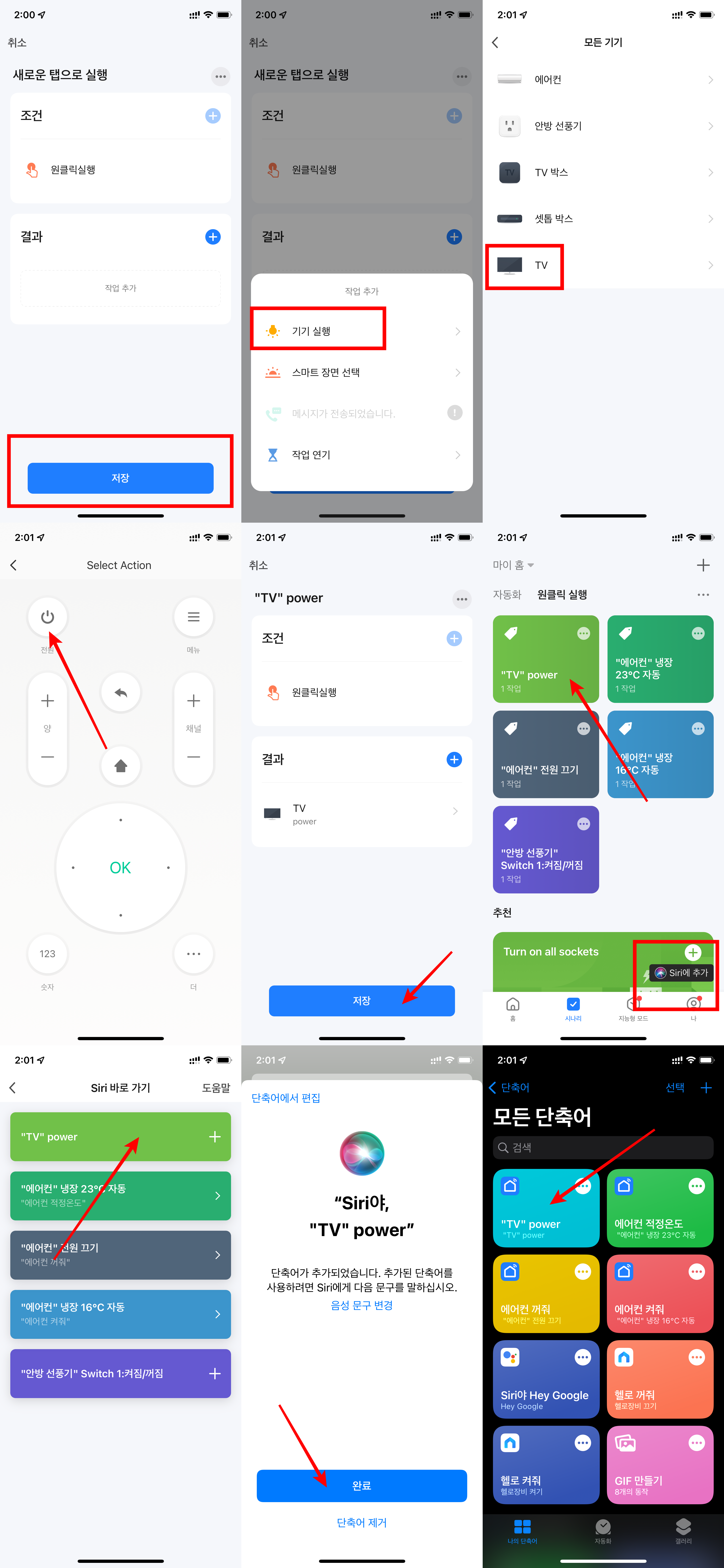 위 사진처럼 원클릭에 기기 실행 정보를 추가한 후 오른쪽 하단에 보면 시리에 추가가 있고 만든 원클릭 단축어를 시리 단축어에 추가할 수 있습니다. 다만 여기서 만든 원클릭 버튼이 TV POWER로 등록이 된것을 알 수 있는데요. 단축어에서 TV Power를 원하늠 여령어로 바꿀 수 있습니다. 저는 안방 TV로 바꾸었는데요. 이렇게 하면 시리야 안방 TV하면 켜고 끌 수 있게 됩니다.