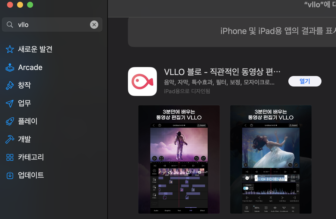 위 방법은 윈도우PC 환경에서 VLLO 블로를 설치하는 방법이고 맥의 경우 인텔칩이 아닌 m1, m2 칩을 탑재한 장비에서는 다른 프로그램 설치 없이 VLLO 블로 설치가 가능합니다. m1, m2 칩은 ARM 기반으로 모바일 어플을 설치 할수 있기 때문입니다. 앱스토어에서 VLLO를 검색하면 설치할 수 있고 아래와 같이 모바일버전으로 어플을 설치하여 이용이 가능합니다.