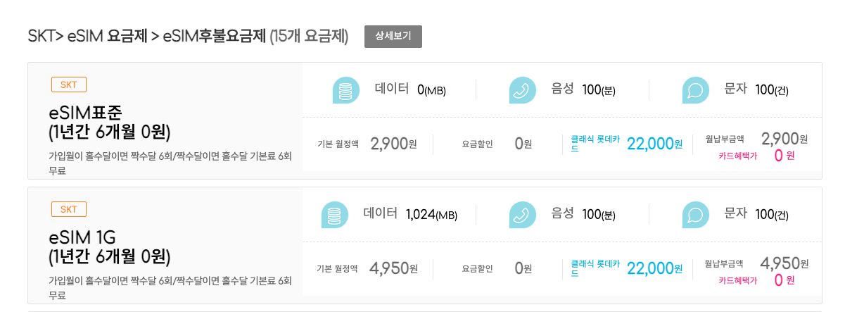 e심은 이용하는 이유는 간단합니다. 번호를 두개를 쓰고 싶은 상황에 추천드리는 방법입니다. 최근에는 개인용과 업무용을 나눠서 이용하는데 투넘버보다는 e심으로 나누는 것을 추천합니다. 이유는 투넘버는 가상의 번호로 인증이 불가능 하지만 e심으로 가입한 번호는 인증이 가능하기 때문에 카카오톡도 두개로 사용할 수 있기 때문입니다. 그렇다면 이제 고민은 그렇게 사용하는 것이 가격 경쟁력이 있느냐라는 것인데요. 일단 먼저 통신 3사가 지원하는 e심 서비스 요금은 현재 8,800원에 가입이 되는 것을 볼 수 있습니다. 그러나 월 1900원으로 가입하는 방법을 알려드리겠습니다.