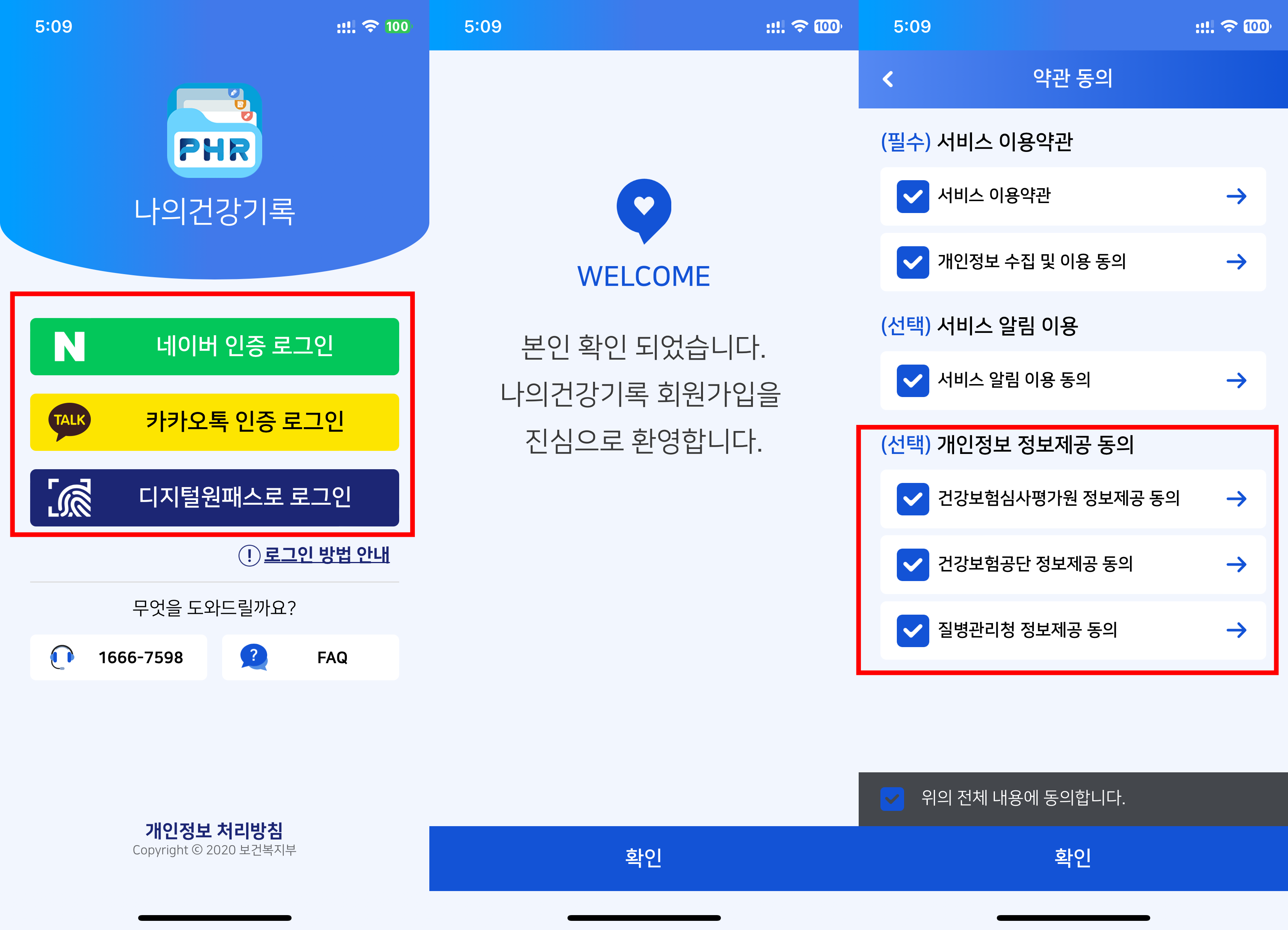 먼저 위에 링크를 통해서 어플을 다운로드 받으시면 인증을 하시면 바로 확인이 가능합니다. 인증을 하면 약관동의를 받아야는데 아무래도 투약이력, 진료이력, 예방접종 이력을 한번에 연동을 할 수 있으니 약관시 선택란이여도 체크하시길 바랍니다.