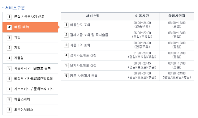 위 농협카드 홈페이지에서 사용이 가능한 서비스의 운영시간을 확인할 수 있습니다. 보통의 경우 24시간 사용이 가능하고 중간 전산처리를 위한 시간 외에는 사용이 가능한 것을 볼 수 있겠습니다. 그러나 대표전화 번호외에도 다른 업무로는 대표번호가 다른데요.