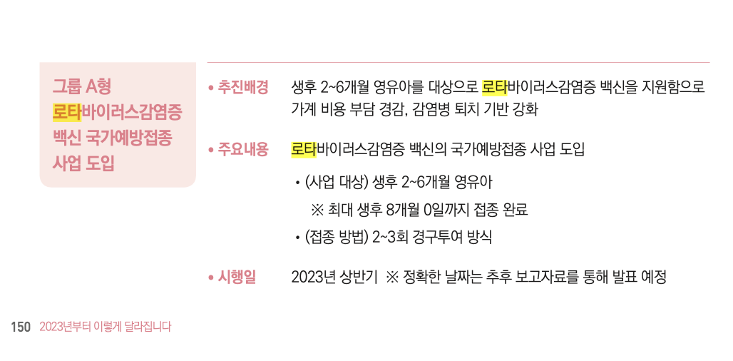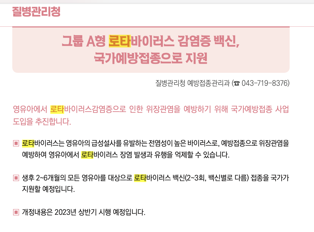 2023년 1월 5일 2023년부터 달라집니다를 발간하였고 질병관리청 내용을 확인해보니 로타바이러스 예방접종이 국가예방접종으로 지원된다고 합니다. 시행은 2023년 상반기 시행예정이라고 합니다. 상반기에 시행 예정이라고 하니 생후 2~6개월 대상자분들은 잠시 기다려 보시는 것을 추천드리겠습니다.