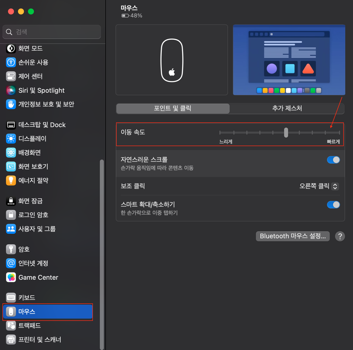 이렇게 속도를 3이 아닌 5로 속도로 설정한 것을 확인할 수 있습니다. 여기서 주의할점은 바로 재부팅을 해야 위 설정이 적용이 됩니다. 재부팅을 하지 않으면 현재 설정된 속도가 5라고 확인은 되지만 매직 마우스 속도가 조절이 안된 것을 확인 할 수 있습니다. 이 방법이 가장 깔끔하고 추가적인 프로그램을 설치하지 않고 설정 할 수 있는 방법입니다.