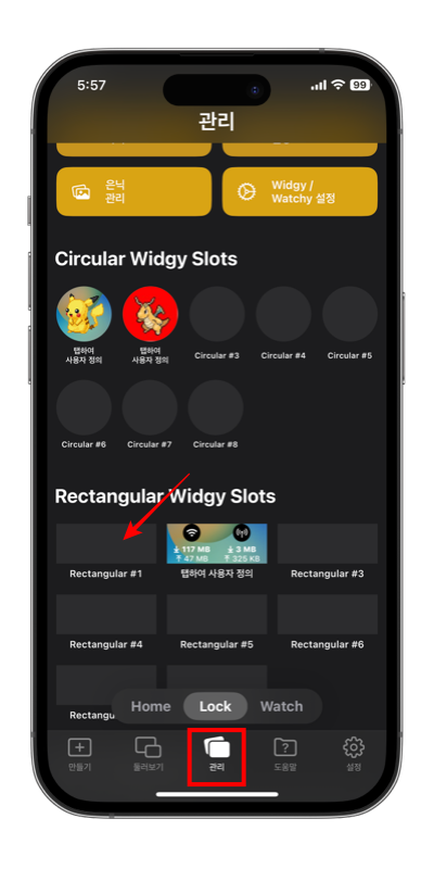 가져오기를 누르면 일단 위젯 슬롯에 넣을 수 있게 됩니다. 이제 위젯 슬롯에 등록을 해야하는데요. 관리에서 Lock 탭에 들어가서 Rectangular Widget Slots에서 원하는 #1, #2 아무곳에나 넣으셔도 됩니다. 그런데 #1에 넣는 것을 추천드립니다.