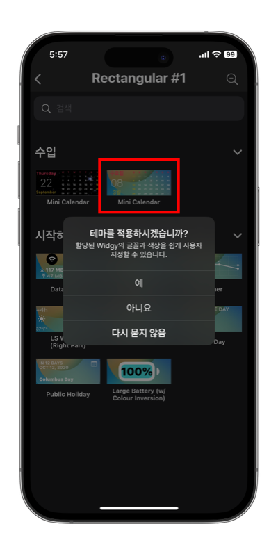 이렇게 위젯슬롯 #1에 mini Calendar 위젯을 추가해보았습니다. 이제는 잠금화면 설정에서 위젯을 추가해서 등록해주시면 되겠습니다.