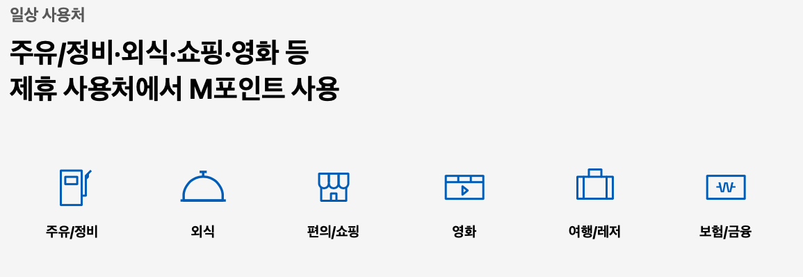 월100만원 미만 사용이나 월 100만원 이상 사용시 M 포인트 적립해택이 달라집니다. 젹립된 M 포인트는 주유, 외식, 쇼핑, 영화, 여행/레저, 보험/금융 등 다양한 곳에서 사용이 가능합니다.