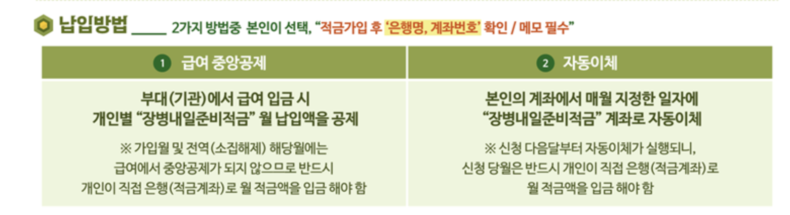 장병내일준비적금 3대 1 매칭 지원정책이란 납입액의 33%를 전역시 추가로 지원하는 것입니다. 주의해야할 점은 중도해지를 하면 안되고 만기해지를 해야 받을 수 있습니다. 주의사항으로는 전역하는 달에는 급여에서 중앙공제가 되지 않기 떄문에 반드시 전역일 전에 개인이 직접 적금액을 납입해야 만기로 해택을 받을 수 있습니다.