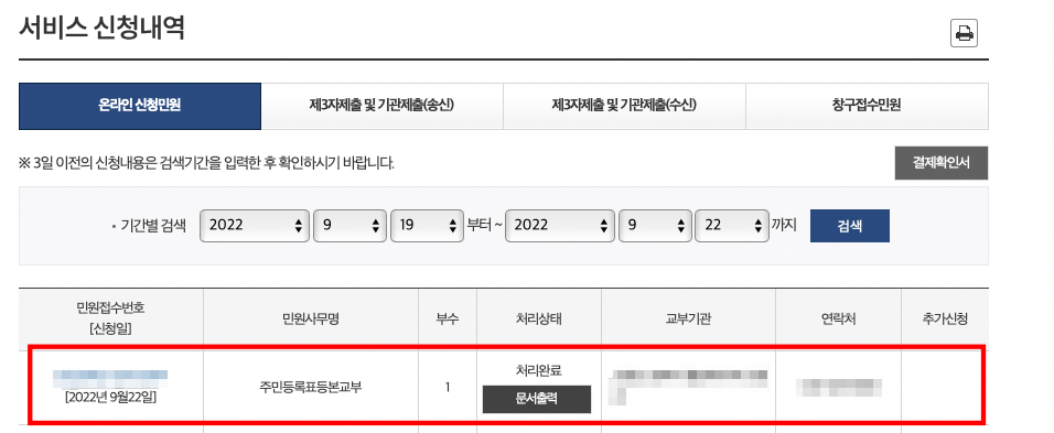 서비스 신청내역을 보면 처리상태에 문서출력이 가능한 것을 확인할 수 있습니다. 문서출력을 누르면 인터넷발급이 가능한 창이 나오게 되고 바로 인쇄가 가능한 것을 볼 수 있습니다. 여기서 주의해야할 점은 만약 프린터가 직접 연결이 되지 않고 공용 네트워크로 연결이 된 프린터를 사용하는 경우 출력이 불가능 합니다.