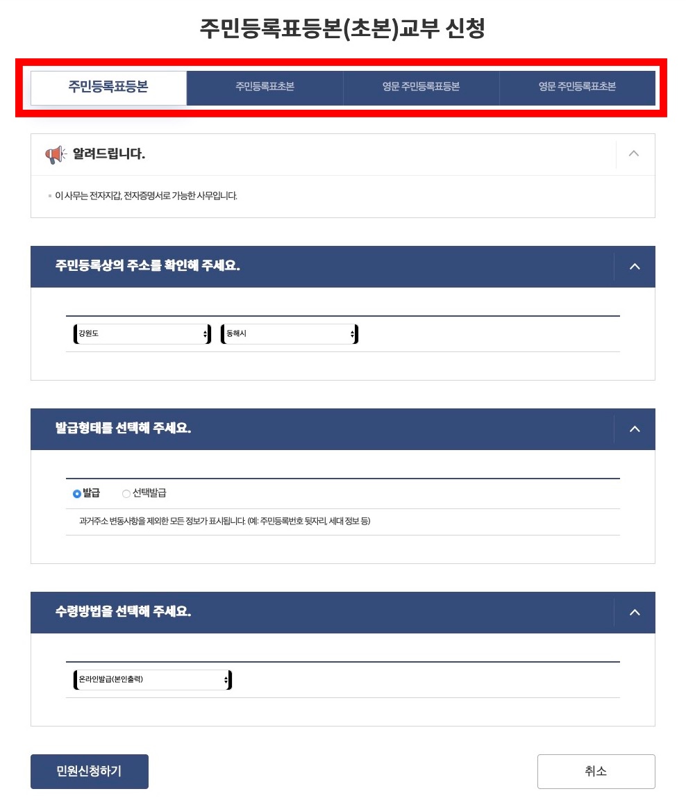 주민등록등본 신청화면을 보면 등본, 초본, 영문등본, 영문초본 총 4가지로 선택이 가능합니다. 수령방법은 인터넷발급, 우편수령(등기, 일반) 으로도 가능합니다.