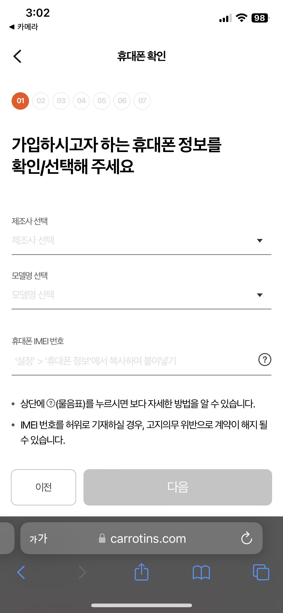 제가 한번 가입을 해보았는데요. 아래에 바로가기 링크로 접속한 다음에 가입을 할 수 있습니다. 제조사, 모델, 휴대폰 IMEI 번호를 입력하면 바로 가입이 가능합니다.