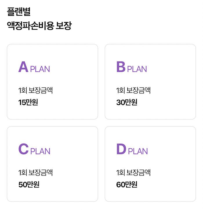 손해액의 자기 부담금이 있습니다. 플랜별로 자기 부담금의 비용이 다릅니다. 플랜 A, B는 손해액 30%(최소 3만 원)이며, 플랜 C, D는 손해액의 40%(최소 3만 원)의 자기 부담금이 있으니 참고하시길 바랍니다.