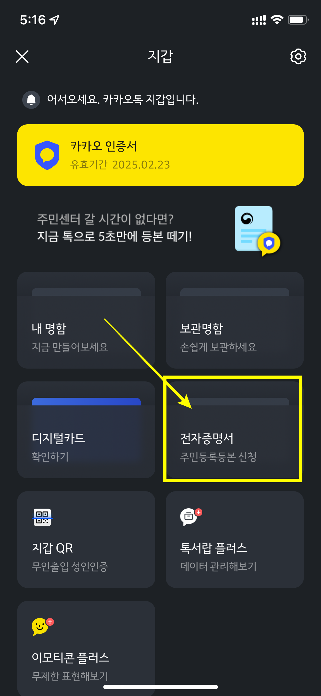 카톡으로 들어가면 더보기에서 지갑으로 들어가면 전자증명서를 뽑을 수 있게 되어 있습니다.