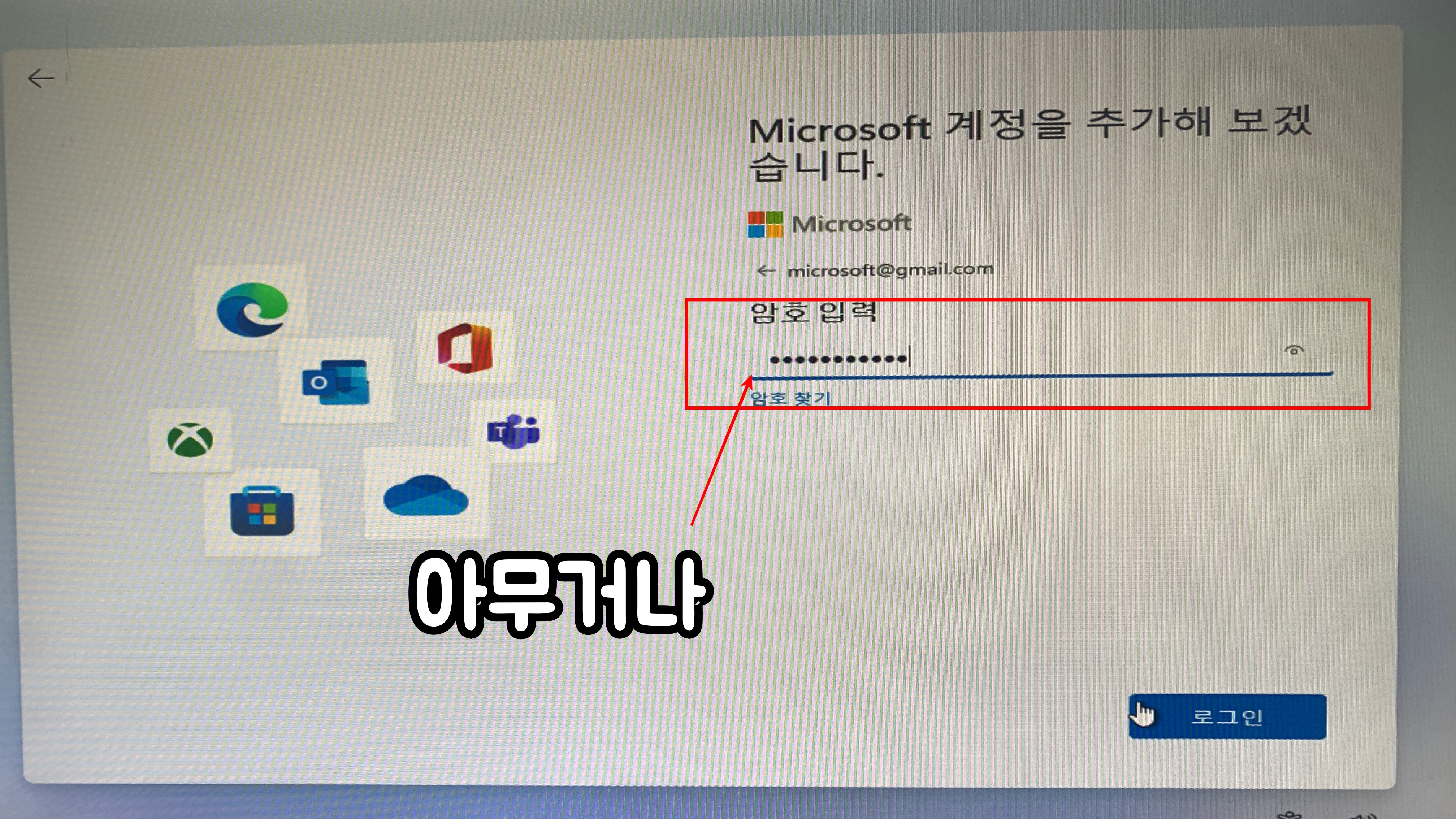 2. microsoft@gmail.com 이렇게 입력합니다. (절대로 로그인이 안될거 같은 계정이죠?)